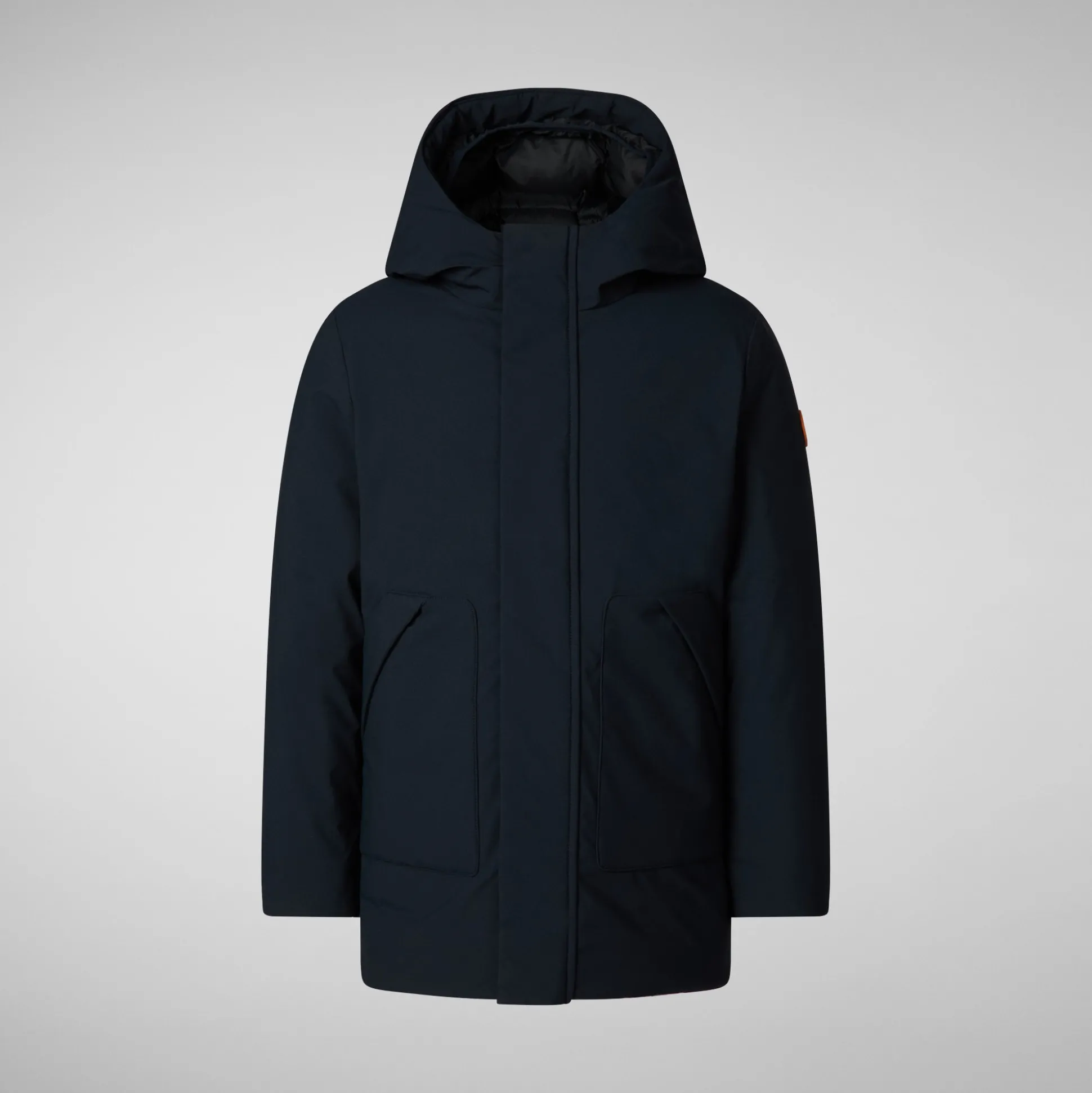 Our Albi parka for boys is designed to provide animal-free comfort even in the harshest temperatures. Featuring low patch pockets, it offers protection against the cold with functional details such as warm padding, a windproof flap covering the zipper, and elastic trim on the hood and cuffs. Signature details include the round logo on the sleeve and the custom zipper pull, adding a distinctive touch.