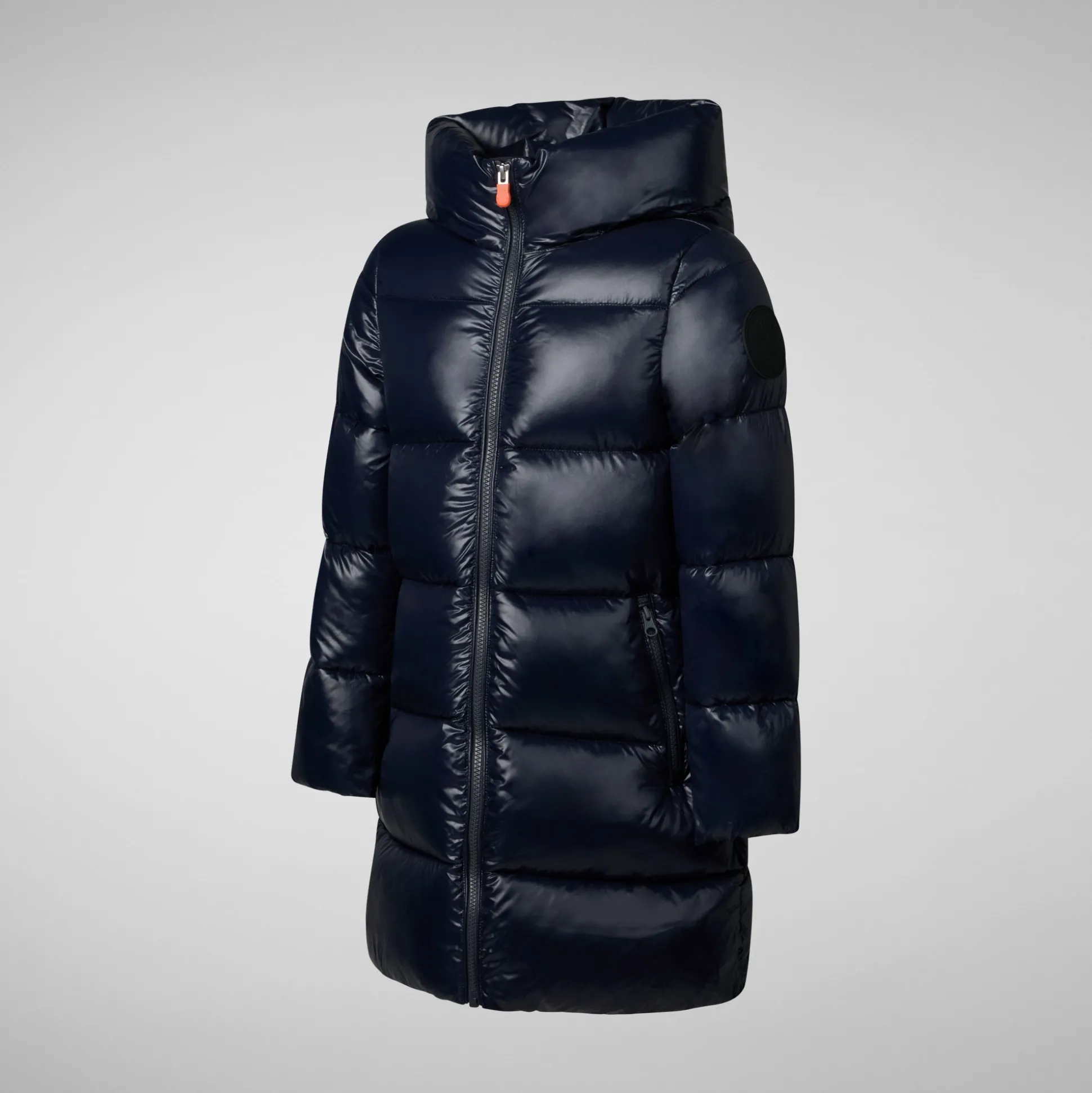 Let your little one refashion the future with our Millie puffer, made from glossy nylon. Shaped to a cute A-line, the design comes with a maxi hood and zipped pockets. Other signature details include the black rubber logo on the sleeve and the orange zip puller.