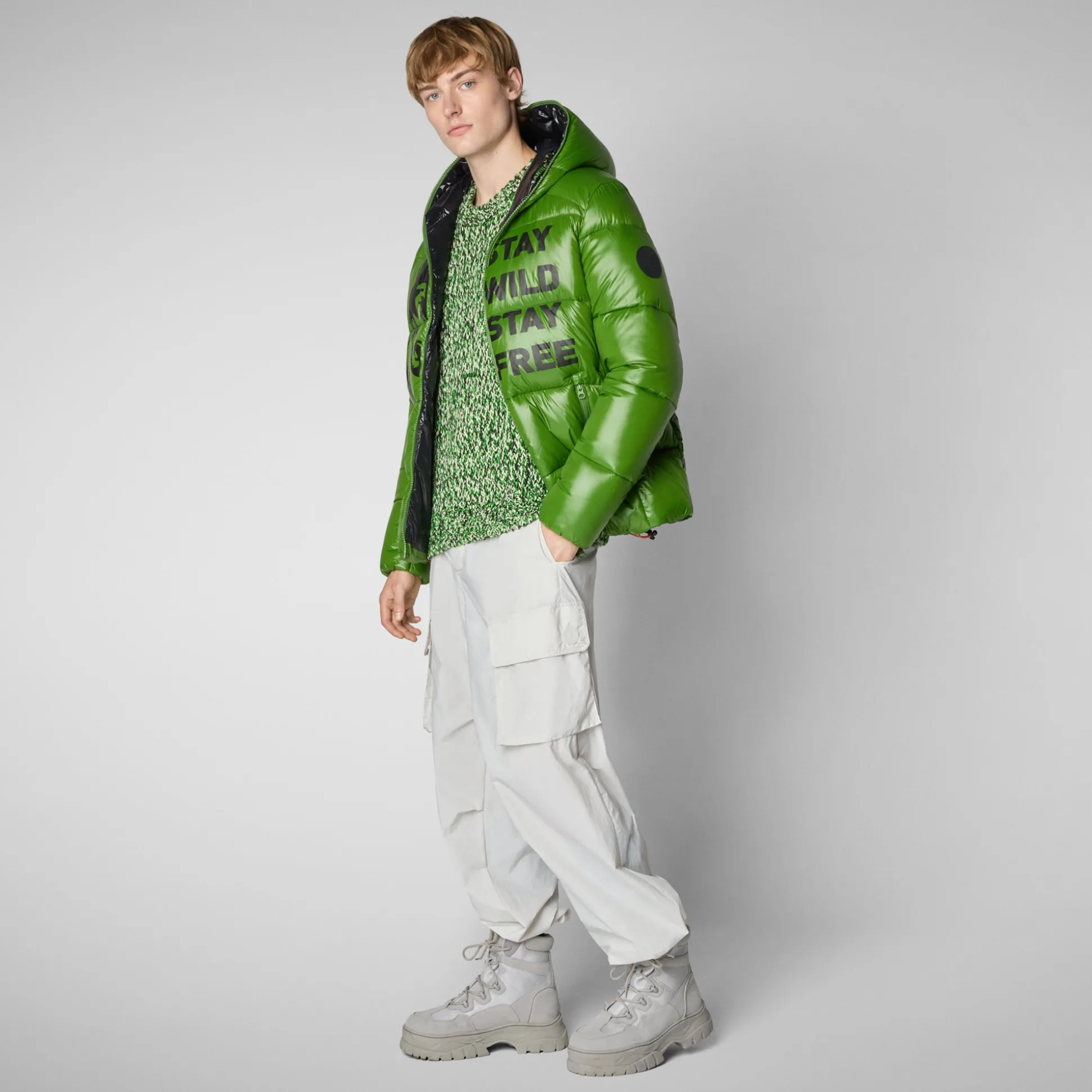 Be the first to review “Men’s animal free hooded Animal free Puffer jacket Evander in grass green wolf print” Cancel reply