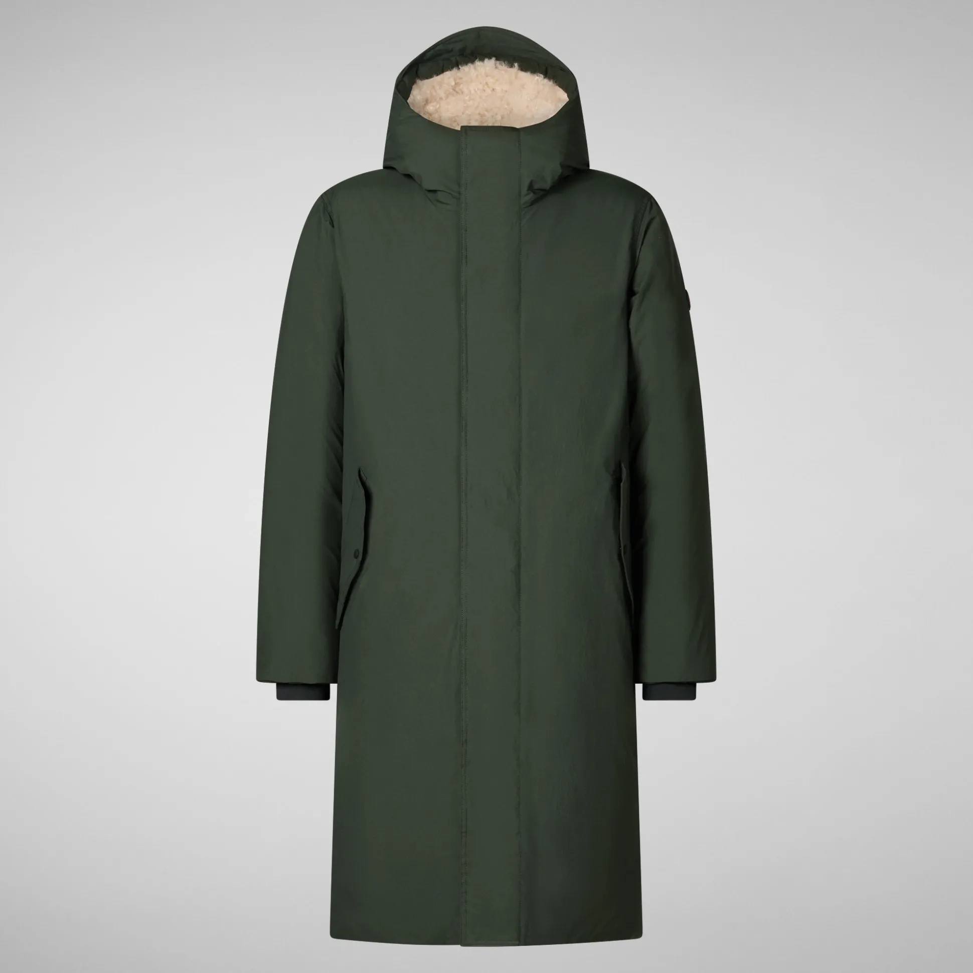 Killian is a padded men’s long parka designed for ultimate warmth and style. It features an adjustable drawstring hood, with the hood and inner trims lined in cozy faux shearling. The central two-way zipper is covered by a flap with hidden snap buttons for a sleek finish. Black custom snap buttons secure the flap pockets, while four inside pockets provide ample storage space. A round logo on the left sleeve adds a signature touch to this versatile parka.