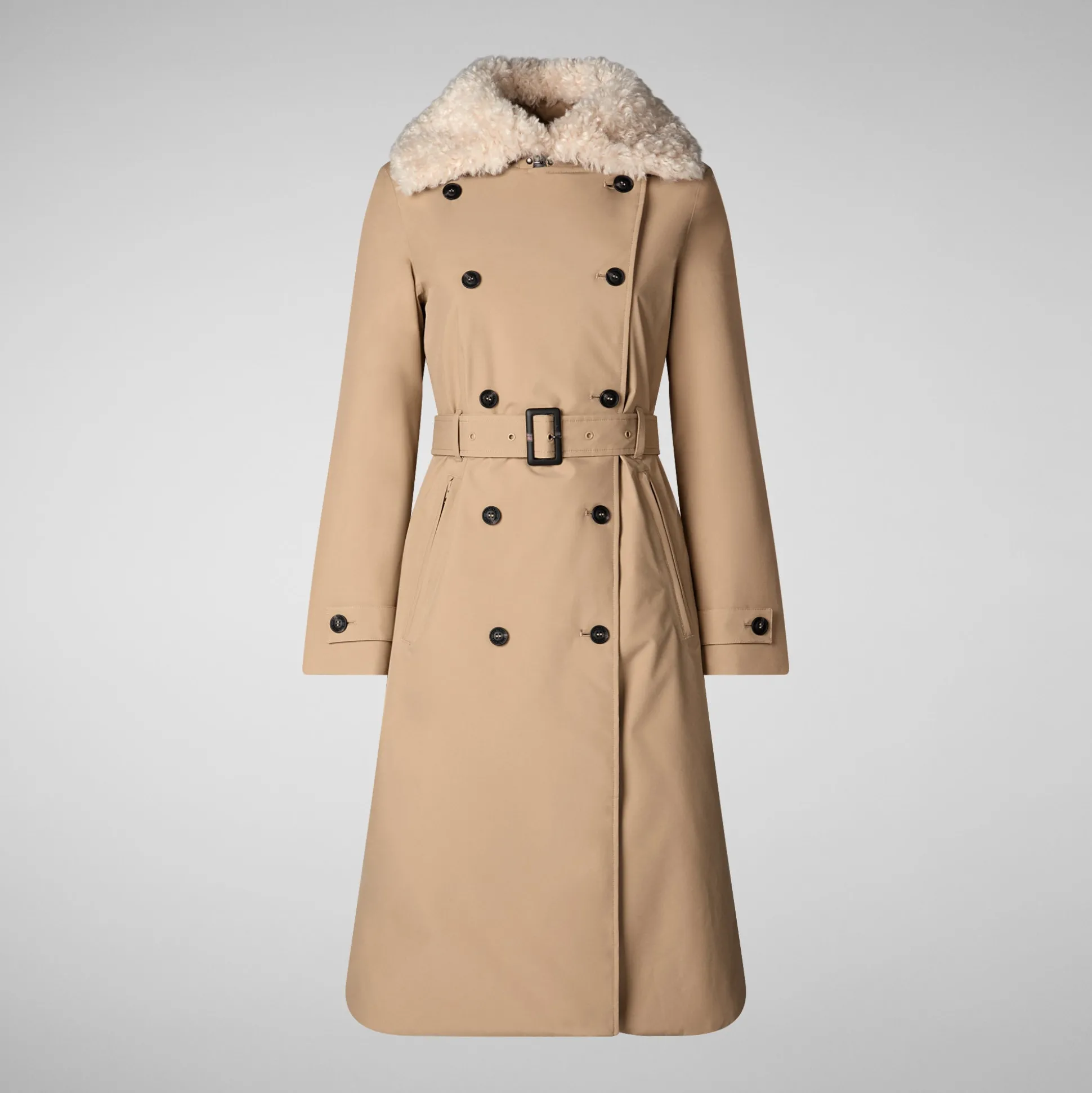 Padded with Recycled Plumtech®, Katrina is your go-to trench coat for the cold season. This style features a removable faux shearling collar, zippered pockets, a belted waist, and buttoned cuffs. The tonal round logo at the back adds a signature Save The Duck touch.