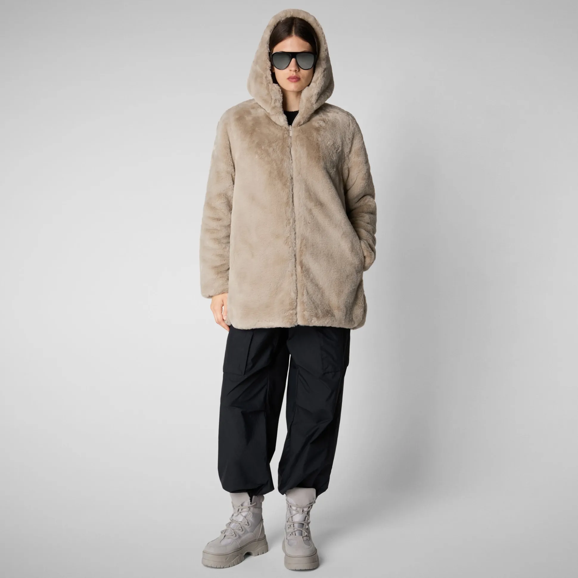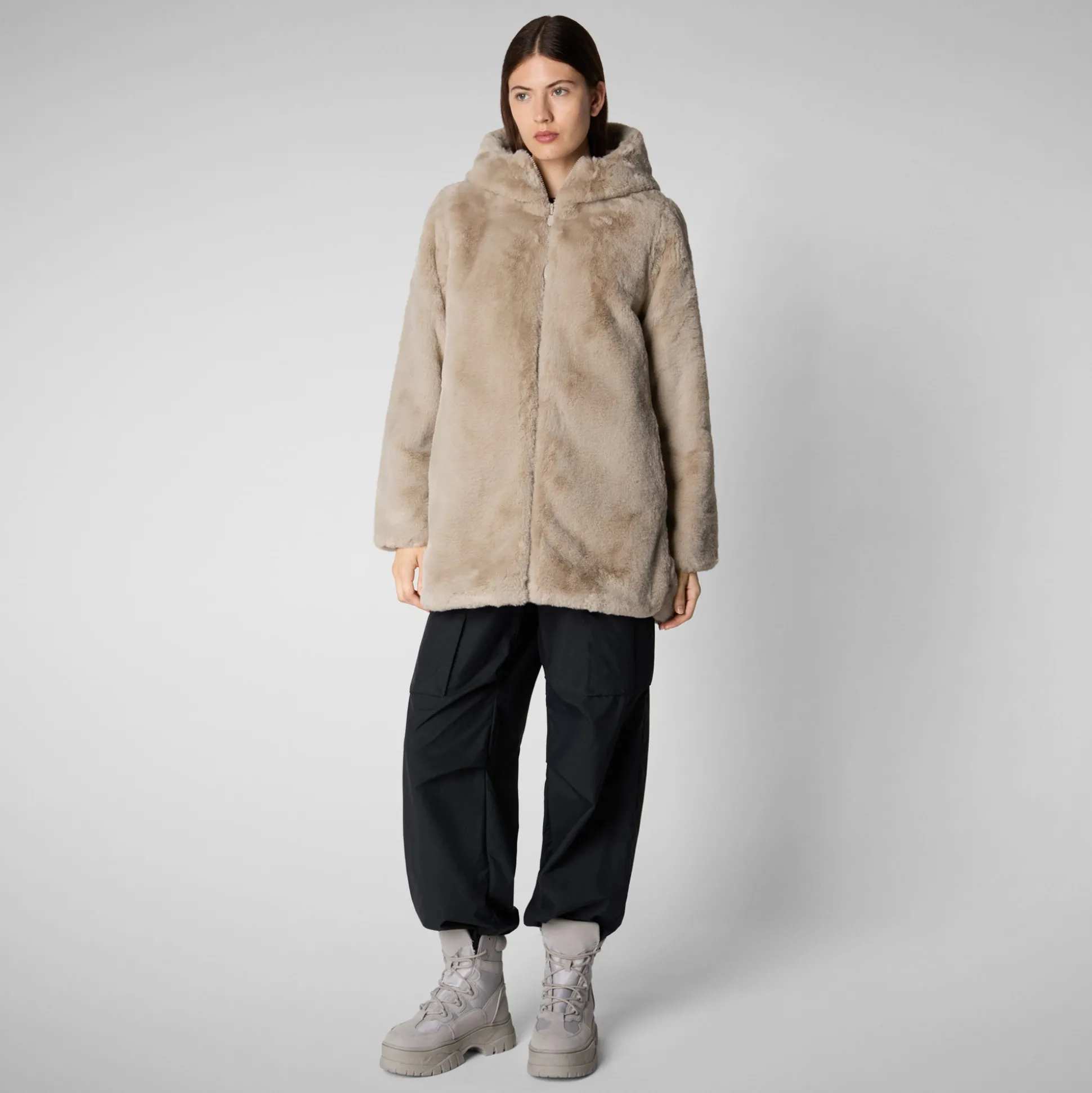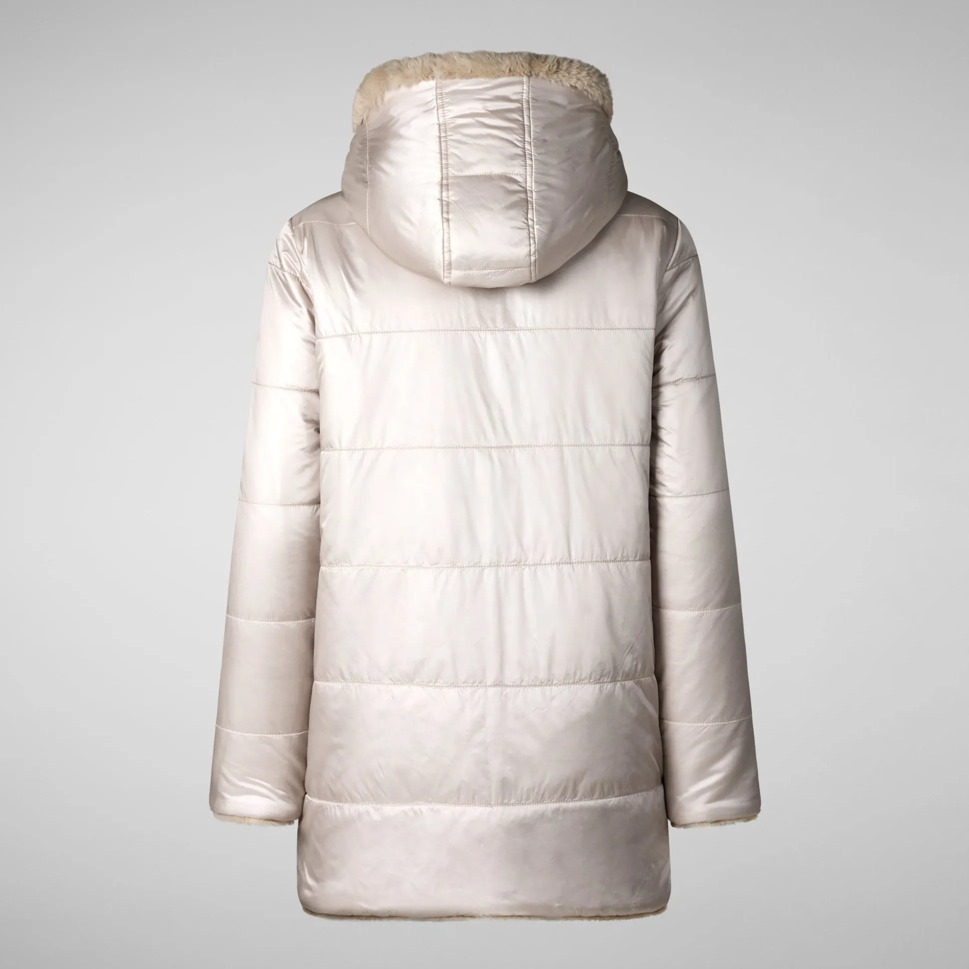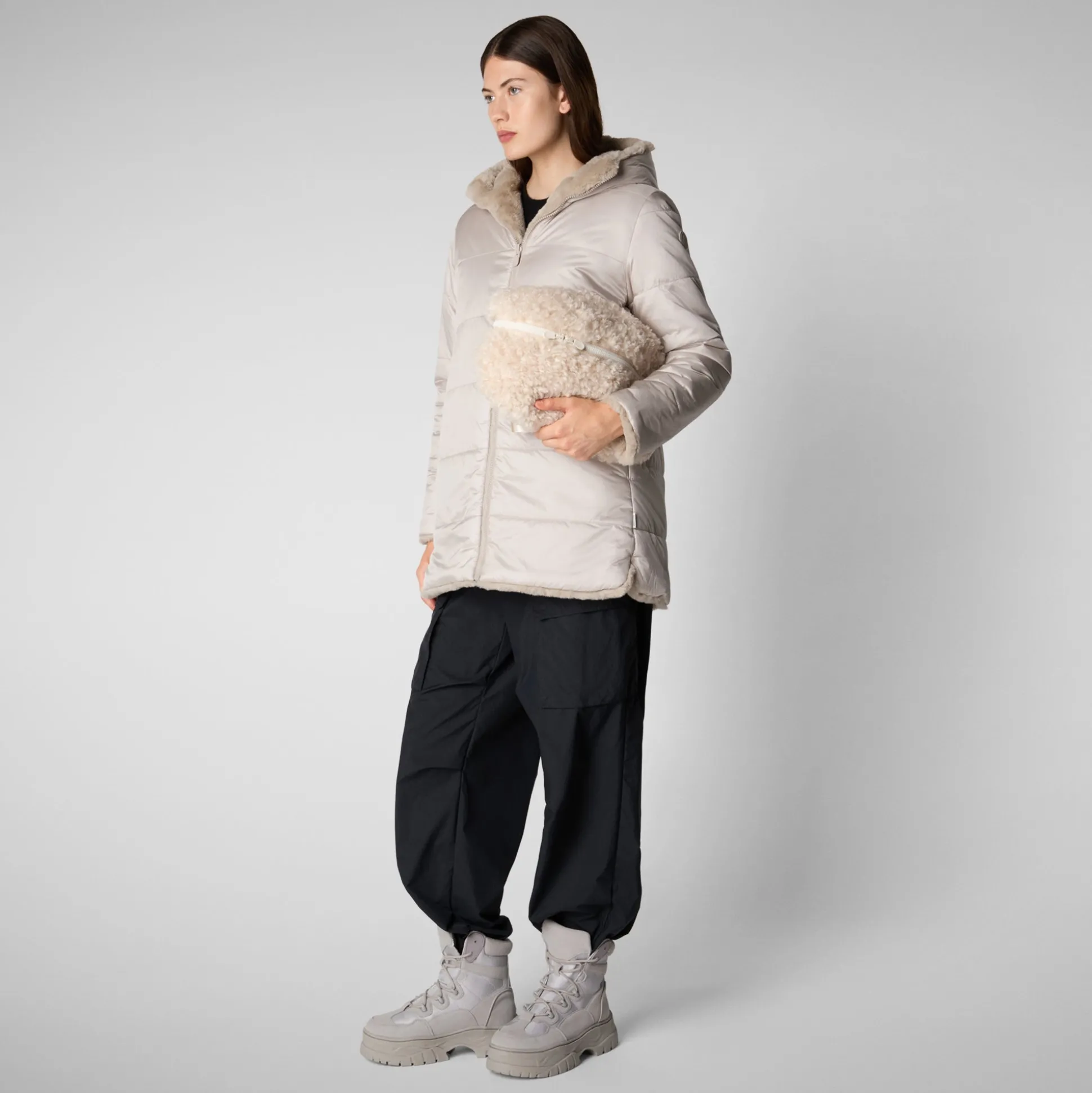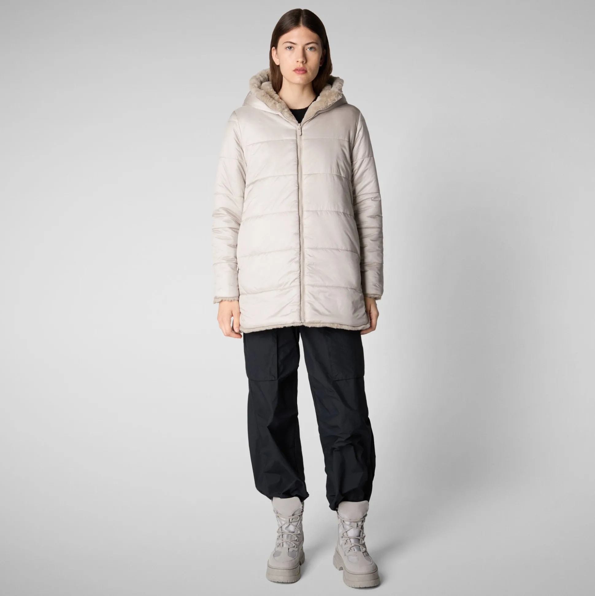 Bridget offers versatile styling options with a reversible design, featuring both a quilted side and a plush faux fur side. It includes a spacious hood and low pockets on both sides. The jacket is secured with a central zipper that has a custom pull.