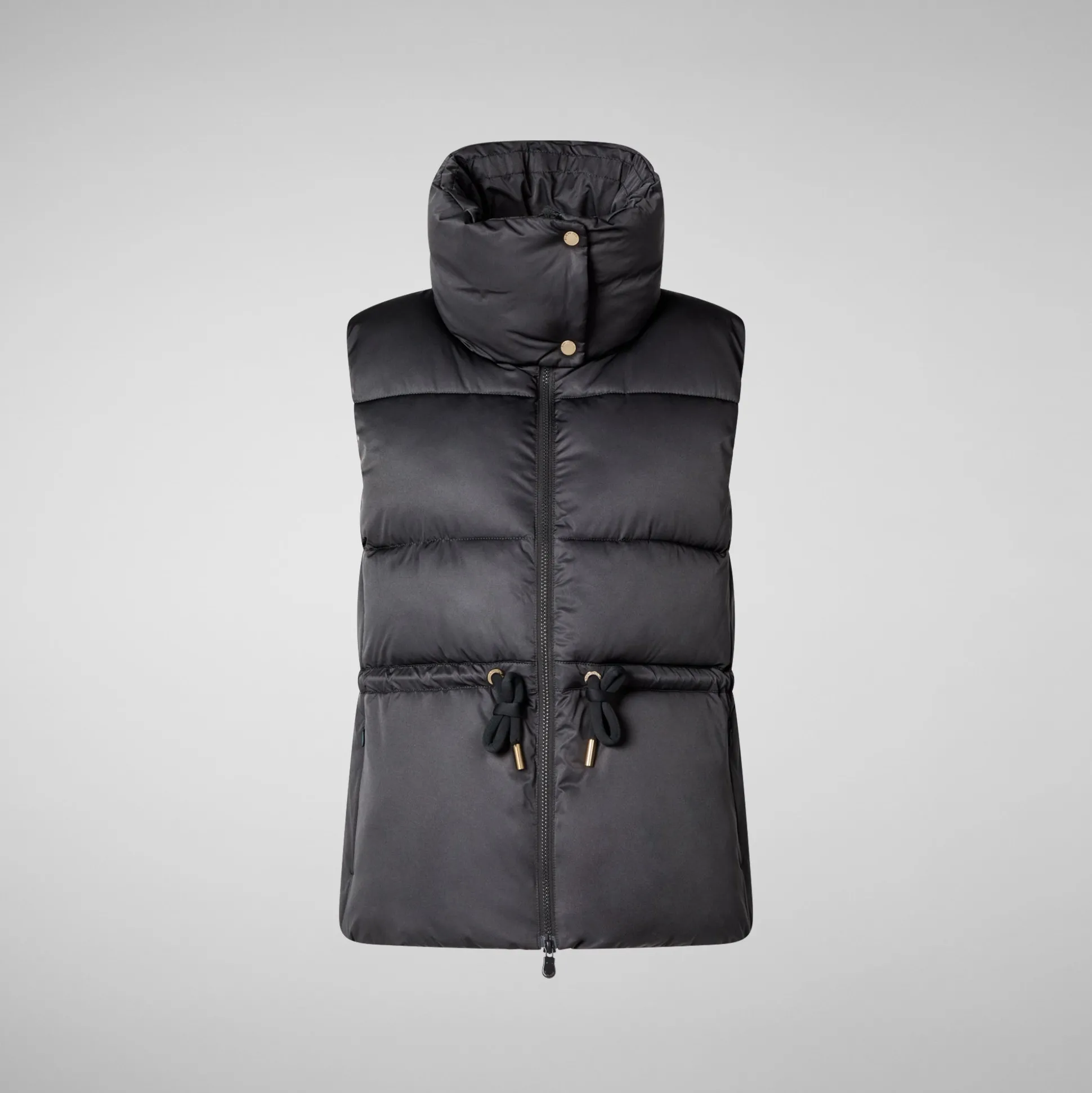 Looking for a reliable companion for layering season? Look no further than our Ren puffer vest, where animal free comfort meets recycled materials. Accented by light gold details, this design features a high neck fastened by two snap buttons. The adjustable drawstring at the waist provides a snug, personalized fit.